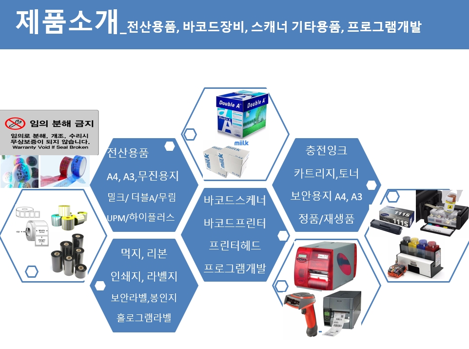 전산용품, 바코드장비, 스캐너 기타용품, 프로그램개발 ,A3,A3,먹지,리본,홀로그램라벨,바코드스캐너,바코드프린터,충전잉크,카트리지,보안용지