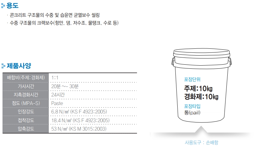 • 수중 구조물의 크랙보수(항만, 댐, 저수조, 물탱크, 수로 등)