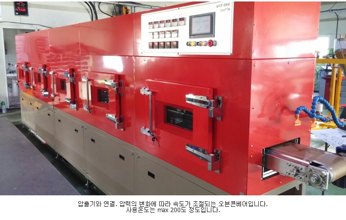 압출기와 연결. 압력의 변화에 따라 속도가 조절되는 오븐콘베어입니다.